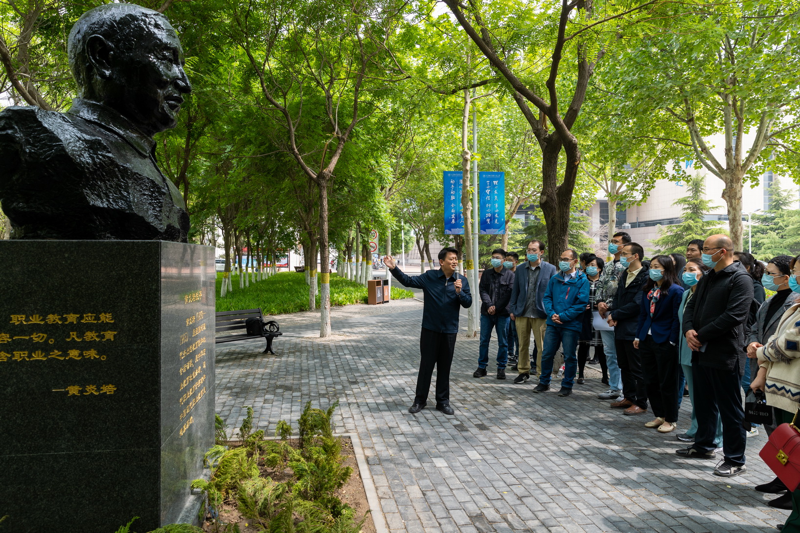 炎培园的“4园二广场”别离是:“笃止园”“励止园”“敏止园”“健止园”“雕像小广场”“念源小广场”,遍地景不雅凝聚展示着复杂的念政育人元素。“专心念书尽心育人”“脚脑并用单脚全能”“金的品行铁的规律”“敬业乐群责先利后”“有行必疑无欲则刚刚”“行必取信止必扎实”等19幅书法篆刻着述沉淀着炎培老师的肉体、风骨。齐体念政课教员跟着现场的出色教学,倘佯正在党史、校史、职教成长史的少河中,细细体会每掬强火,每朵浪花中所蕴藏的炎培肉体、黉舍办教观念战教员任务情怀。